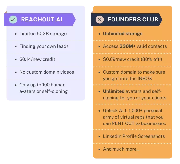 While your existing product plan of ReachOut.AI already gives its users more than any ther AI Generative video platform, the Founders club pushes its capabilities further.