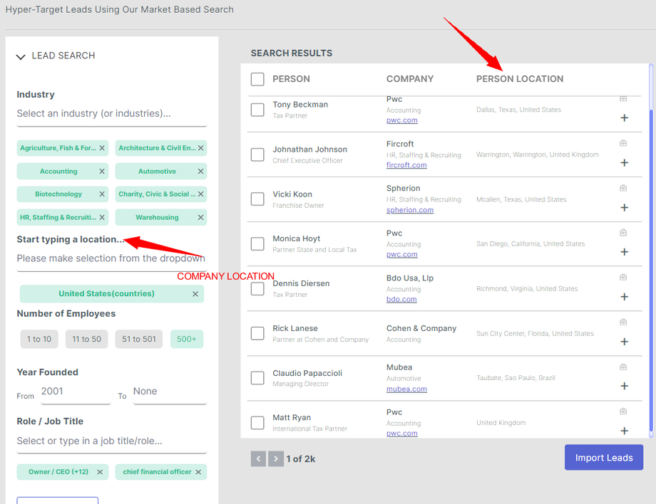 In a bid to improve the effective use of the lead researching, we plan to add a "Person's Location" attribute to the search filters. This new addition will allow the ability to acquire highly specific and accurate data for both search criteria.
