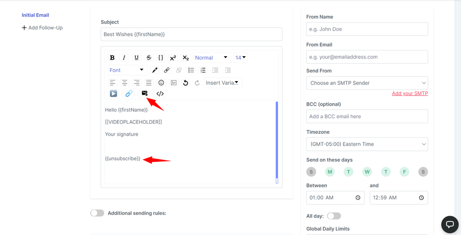Method #2: Add an unsubscribe link to your emails by clicking this button in the Email Scheduler editor.